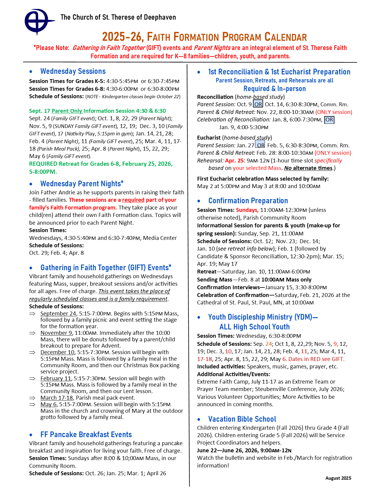 Our Faith Formation calendar for the 2025-26 school year is available below. Please update your family calendar to include these important dates. We look forward to seeing you and your children!