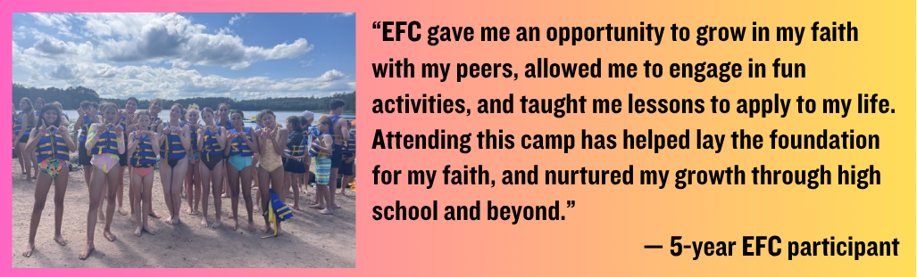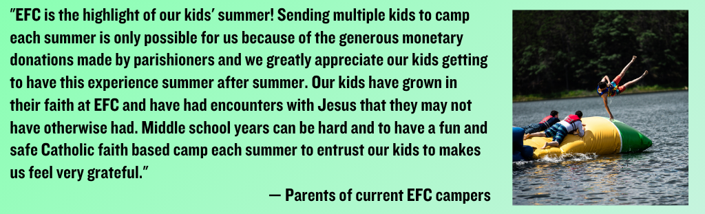 EFC is organized and led by youth ministers from around the Archdiocese. Our aim is to give middle schoolers an awesome week of camp, grounded in the Catholic faith and Sacraments, where they can see that faith and fun can coexist, personally encounter the God who loves them so much, and form life-long habits of faith and prayer. This week of camp has changed lives.