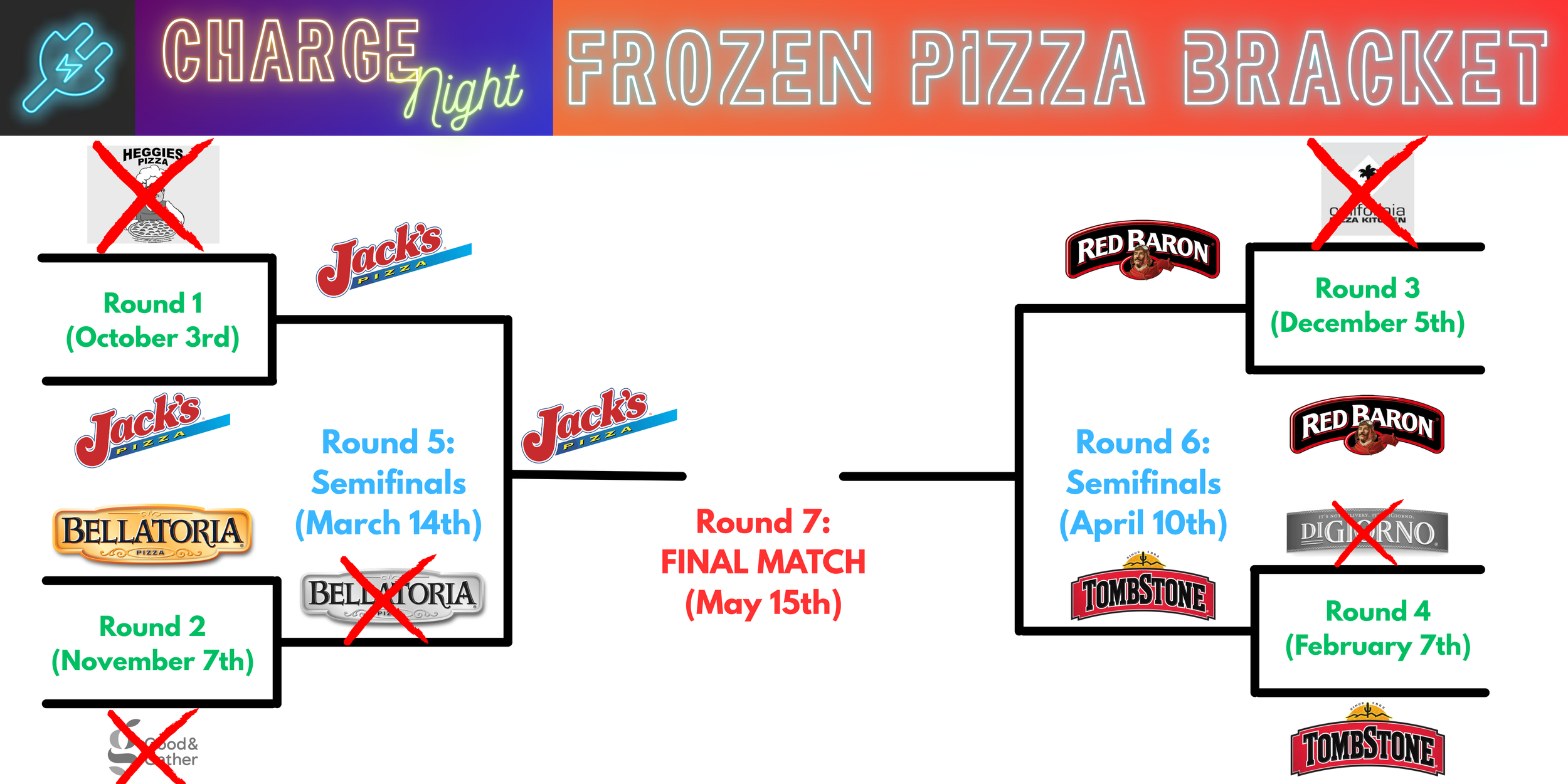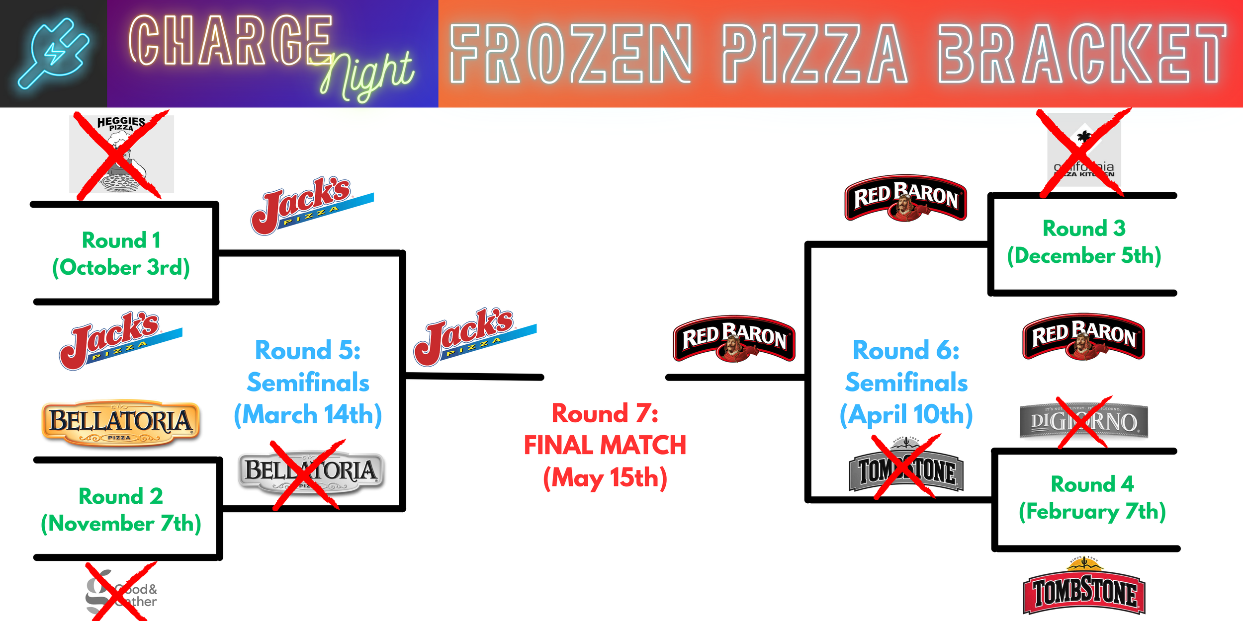 We are excited to announce an exciting new component to this year's Charge Nights: our Frozen Pizza Bracket!